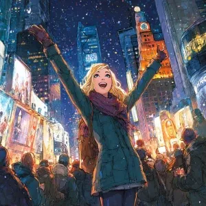 «A young woman celebrating New Year's Eve amidst the vibrant ligh...»