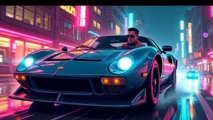 «stylish character driving a sports car through neon-lit city str...»
