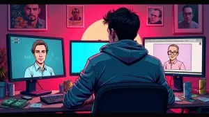 «cool young man sitting at multiple monitors surrounded by memes,...»