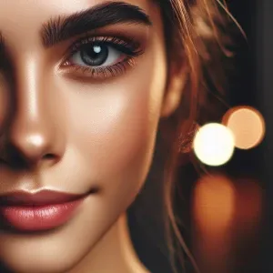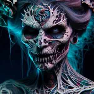 «close-up; underexposed, dramatic, dark; intense alien-like femal...»