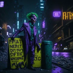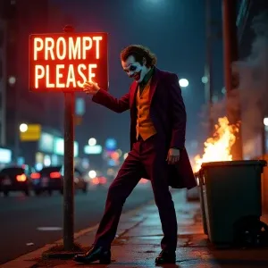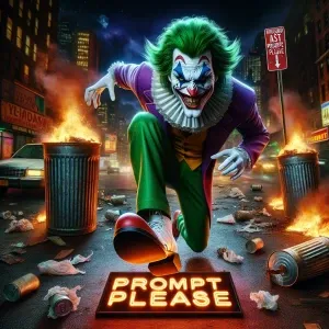 «hyperrealistic Image of The Joker stepping on a sign that says[P...»