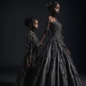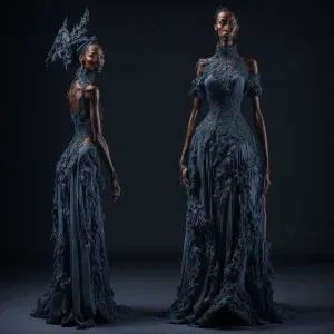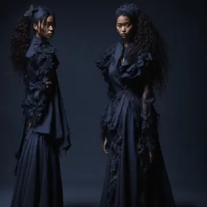 «a girl in a flowing blue dress, designed with intricate embroide...»