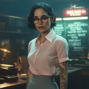 «A cinematic close-up of Dahlia Valentina as a Continental Admini...»
