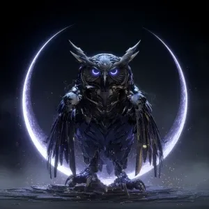 «A powerful mechanical owl perched before a glowing crescent moon...»