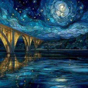 «A celestial stained glass artwork depicting an illuminated bridg...»