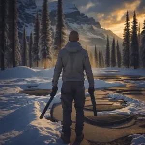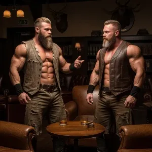 «make an image of 2 snow boarders in the mountains that are dress...»
