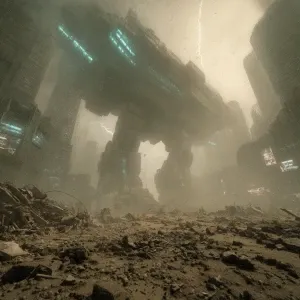«Dust-choked remains of a futuristic metropolis. Ground-level per...»