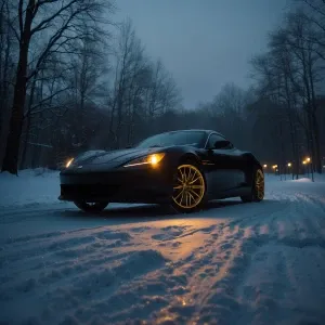 «A sleek black sports car parked on a snowy road at night, illumi...»