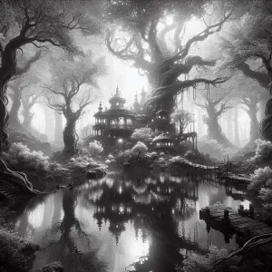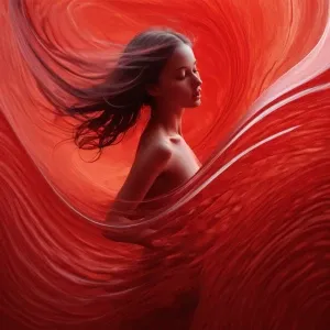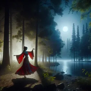 «girl in red, dancing in the moonlight at the forest near the lak...»