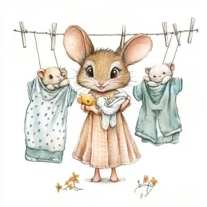 «Cute mouse with expressive eyes, hanging laundry on a line which...»