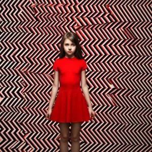 «Create a 3D-rendered image of a colossal cat towering above the...»