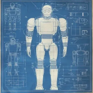 «A detailed specification sheet on blueprint paper for robot with...»
