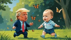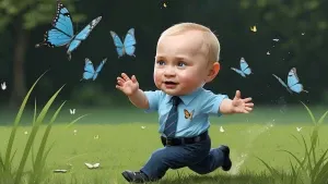 «baby Trump runs on the grass and catches butterflies, the charac...»