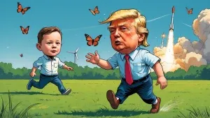 «baby Elon Musk in children room, use pixar and satirical art sty...»