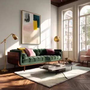 «Create a cozy Scandinavian reading corner featuring a velvet arm...»