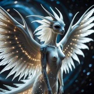 «An otherworldly being with shimmering cimmerian wings, each feat...»
