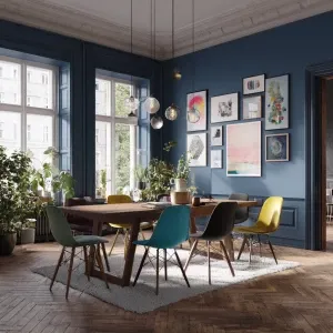 «Create an image of a Nordic dining room featuring deep blue wall...»