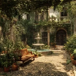 «Create an image of a serene stone courtyard adorned with lush cl...»