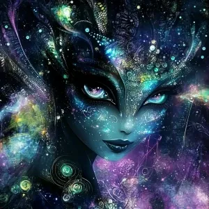 «Create a 2.5D cosmic background featuring a girl alien with cele...»