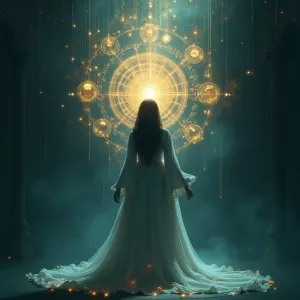 «Create a 2.5D masterpiece portrait of a time-weaving oracle, the...»