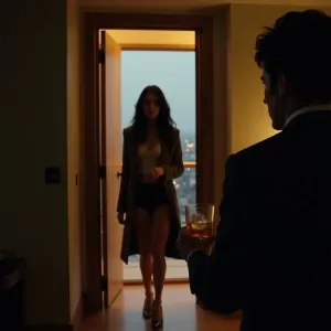 «A cinematic, moody evening scene in a modern high-rise apartment...»