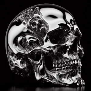 «highly reflective, polished metal skull face, distorted and twis...»