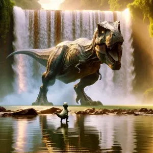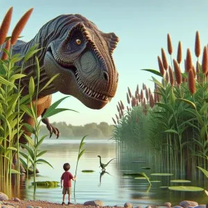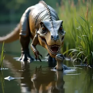 «A realistic t-rex pushing aside water rushes to afford him a vi...»