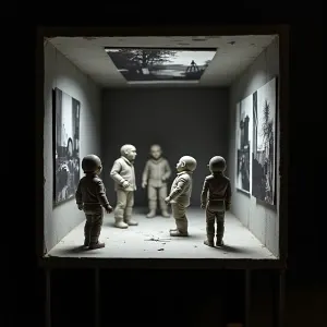 «A photographer's darkroom where developed images step out of the...»