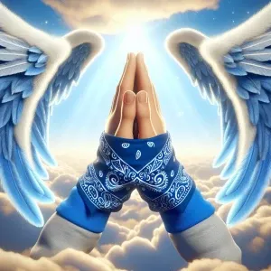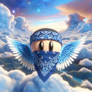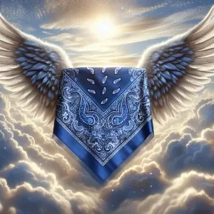 «a blue paisley bandana,angel wings, set against a backdrop of et...»