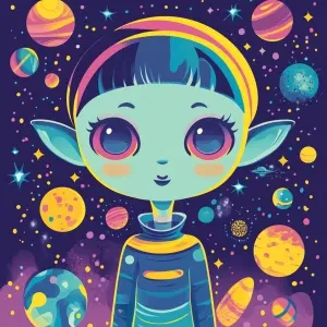 «Create a 2.5D cosmic background featuring a girl alien with cele...»