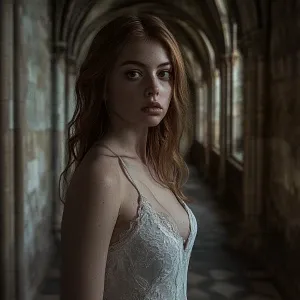 «A dimly lit gothic cathedral hallway with intricate stone and we...»
