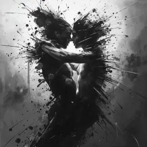 «A dynamic, emotionally charged monochrome painting of two figure...»