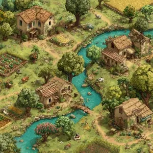 «A beautiful 2D moral story village, rendered in a charming carto...»