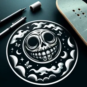 «Skateboard brand called spitfire like smiley face very detailed...»