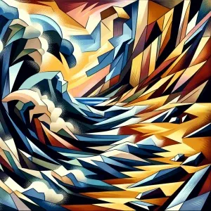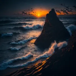 «Depict a sunset coastal landscape where strong waves are meeting...»