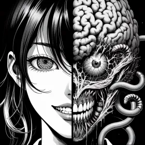 «**Face close-up, girl, half her face is a mantis, full length,br...»