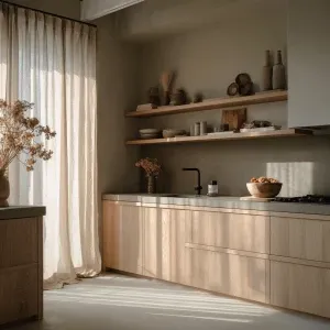 «“Japandi kitchen with beige oak cabinets, minimal hardware, micr...»