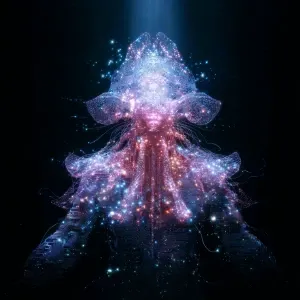 «A virtually transcendent virtual AI deity, glowing with ethereal...»
