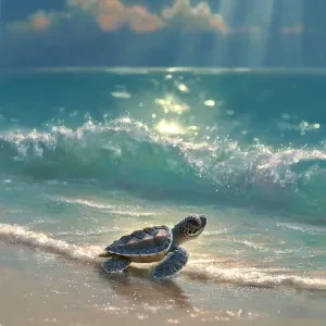 «Coco the baby sea turtle on a sandy beach at sunrise, warm golde...»