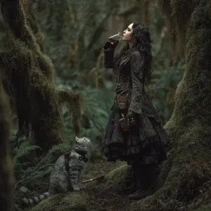 «In the depths of a gloomy deep green forest, a brunette in an in...»