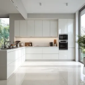 «Create an image of an ultra-modern kitchen with all-white cabine...»