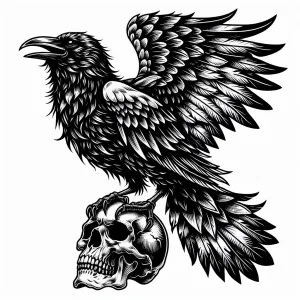 «A black-and-white tattoo design of a raven with spread wings per...»
