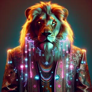«Lion in Indian sherwani, cyberpunk style, neon»
