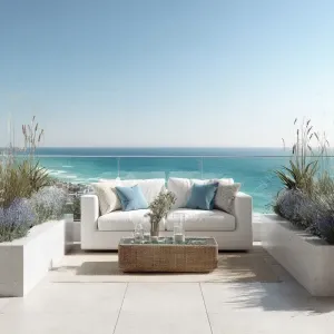 «Create a scene of a luxurious coastal lawn with a stunning ocean...»