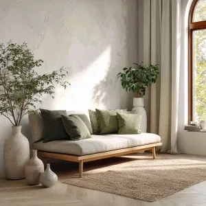 «Create a Scandinavian living room featuring oak wood furniture,...»