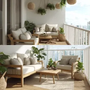 «Create a scene of a luxurious outdoor patio featuring white cush...»