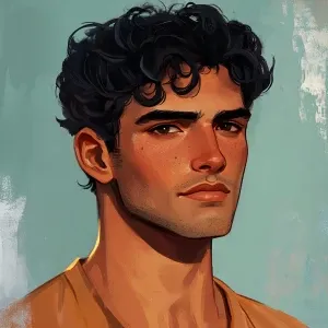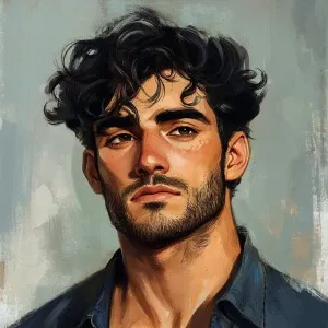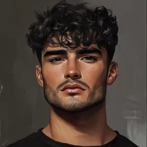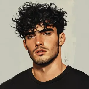 «Cute man with black curly hair, short hair, thick eyebrows and a...»