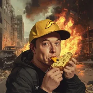 «Elon Musk,Wearing a baseball hat with banana logo on it . Eating...»