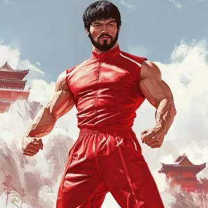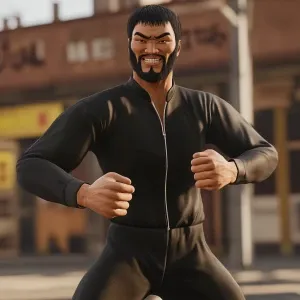«White muscular thin man with beard, big chin, smile and cheekbon...»