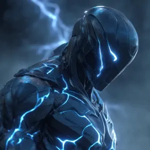 «A futuristic armored superhero in a full-body black suit with gl...»